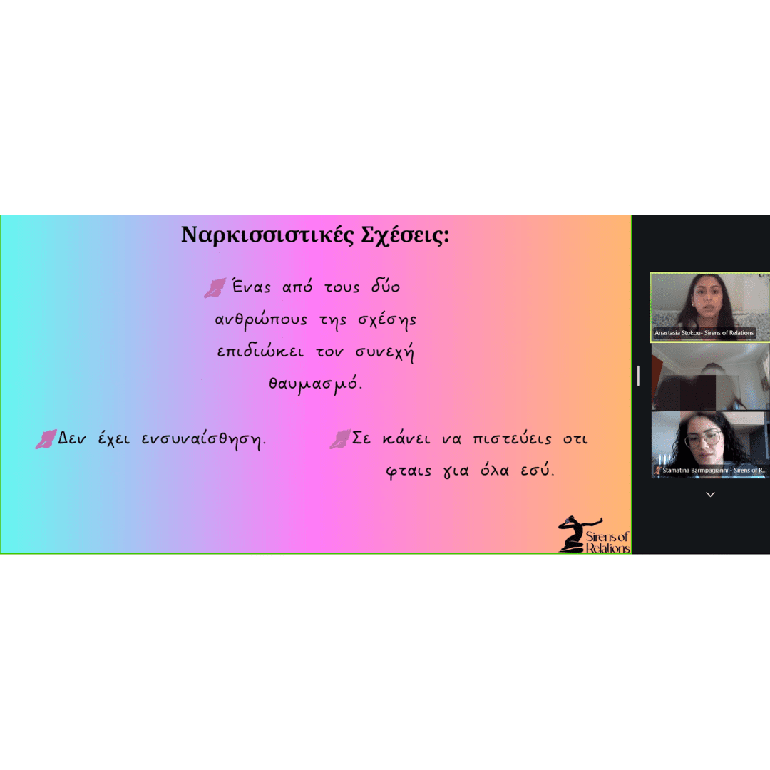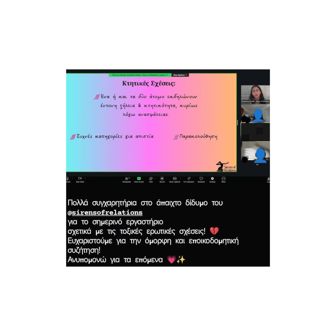 Το Σάββατο 01 Ιουνίου 2024 είχαμε πραγματοποιήσει το πρώτο μας διαδικτυακό δωρεάν βιωματικό εργαστήριο με θέμα: Τοξικές Ερωτικές Σχέσεις